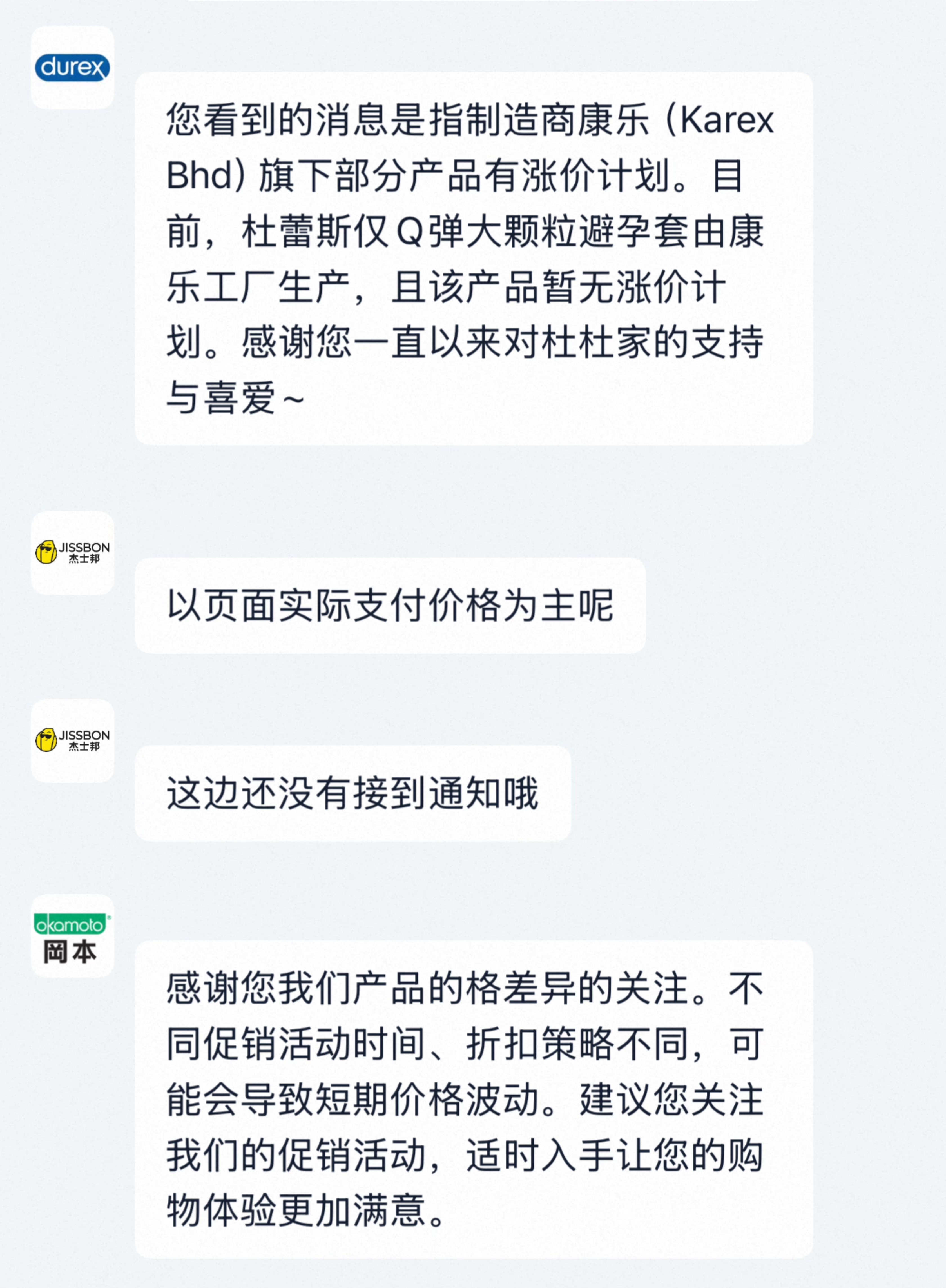 今日记者征询多个躲孕套品牌客服,盘问其产物能否会加价。